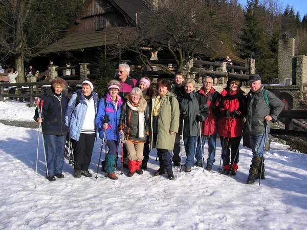 Zanim o godz. 9.25 odnaleźliśmy nasz punkt startowy w Ustroniu Dobce, dokładnie poznaliśmy sieć dróg błąkając się ok. 20 min. pomiędzy Ustroniem i Wisłą. Ale potem same przyjemności. Trasa i pogoda okazała się super łagodna dla zimowych spacerowiczów. Temperatura około zera, prawie bezwietrznie, na dole sucho i bezśnieżnie a czasami nawet niezła widoczność. Ale ponieważ jest styczeń więc i śnieg się wkrótce pokazał. Do Chaty na Orłowej (770 m) dotarliśmy już w śniegu po kostki a nawet z lekkim poślizgiem. Chata to miłe schronisko, gdzie część naszych załogantów zrobiła sobie pierwszy popas. Pełen luz – czasu mnóstwo, po drodze czekają na nas jeszcze co najmniej dwa schroniska. Nikt i nic nas nie goni. Ale ja ruszam dalej, bo się troszkę boję zejścia po śliskim zboczu. Wychodzimy niebiesko-zielonym szlakiem. Jest około 20 cm śniegu i początkowo naprawdę dość ślisko. Ale co za widoki! Z lewej majaczy Czantoria Wielka i Mała, z prawej, między drzewami prześwituje Skrzyczne a po zejściu 100 m niżej na Przełęcz Beskidek skończyły się wszelkie schody i już bezstresowo, spacerkiem, mijając po drodze wielu spacerowiczów w kościółkowych butkach, już w pełnym słońcu docieramy do Zbójnickiej Chaty pod Równicą - prześlicznej, trzypoziomowej bacówki (ale bardzo drogiej). Wita nas mnóstwo ludzi i naszych i nie naszych, opalających się przed Chatą. Ja jednak ze sporą liczbą naszego koleżeństwa wolę popas w środku przy piwie, ciepłym kominku i uroczych czardaszach. W pewnej chwili po raz pierwszy w życiu słyszę niedawno poznaną słowacką piosenkę pt. "Javorina" w kapitalnym i fachowym góralskim wykonaniu. Po godzinnym popasie opuszczamy Zbójnicką Chatę i idziemy do kolejnego - dużego schroniska przy parkingu pod Równicą. Tutaj kolejna godzina przy pysznej zupie grzybowej i nie tylko. Ale biesiadujący obok Stefan daje w końcu hasło do odwrotu, upominając wszystkich by nie pomylili szlaku, bowiem czerwony szlak, którym mamy schodzić, przechodzi przez Równicę w obie strony. My mamy schodzić w kierunku północnym do Ustronia Zdroju. I tak też idziemy. Po 20 min. marszu, z lewej strony mijamy ewangelicką "kapliczkę" a po następnych 30 min. wchodzimy już do Ustronia. Teraz jeszcze tylko pozostaje odnaleźć miejsce postoju autobusu. Dzielny Stefan ruszył na poszukiwanie zostawiając nas tuż za mostem na Wiśle, przy straganie z mnóstwem zimowych czapek. Po chwili, naprowadzani jego komórką, odnajdujemy autobus na Rynku pod Ratuszem i tu konsternacja – brakuje czarnej Danusi. Ostatni raz widziano ją na Równicy a potem jakoś nikt jej nie lokalizował. Zanim jednak zaalarmowaliśmy GOPR, policję, WOP i sami rzucili się na poszukiwanie, Danusia z piskiem taksówkowych opon, z fasonem zameldowała się przed nami. Okazało się, że jako jedyna pomaszerowała czerwonym szlakiem na południe i wylądowała w odległości ponoć 30 zł za taxi od naszej mety, w Ustroniu Polana. Ale zdążyła akurat na czas i o 16.00 zgodnie z planem ruszyliśmy w drogę powrotną do Krakowa. Dzięki Stefanku za ten bezstresowy spacerek po Beskidzie Śląskim w jak zwykle miłym, nie gderającym a cieszącym się życiem koleżeństwie.